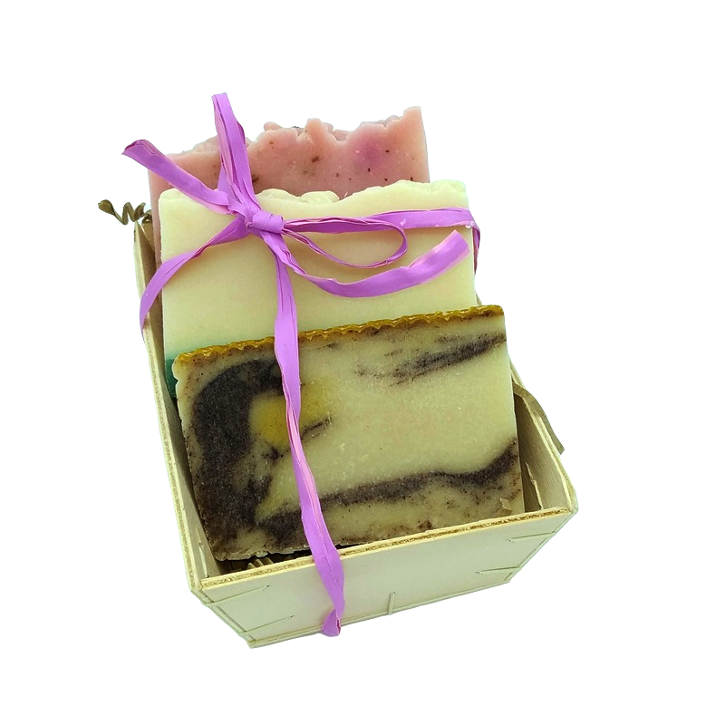 3 Trozos de jabón de aceites +- 300 grs (los tres)+ Bandeja madera los jabones están todos cortados a mano, los aromas, colores y recipiente pueden ser diferentes a la foto. Van envueltos en papel celofán, y con lazo.