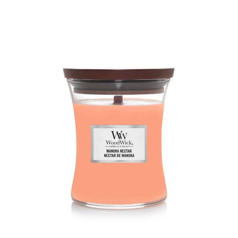 Una rica fragancia combinada con una llama danzante y un suave crepitar en una vela en forma de de reloj de arena.